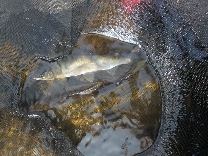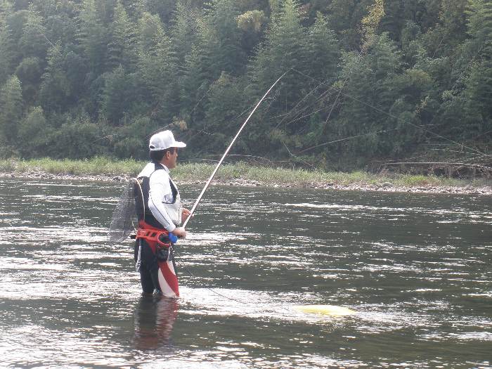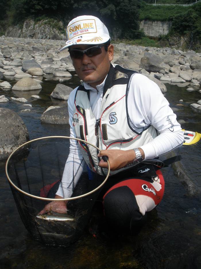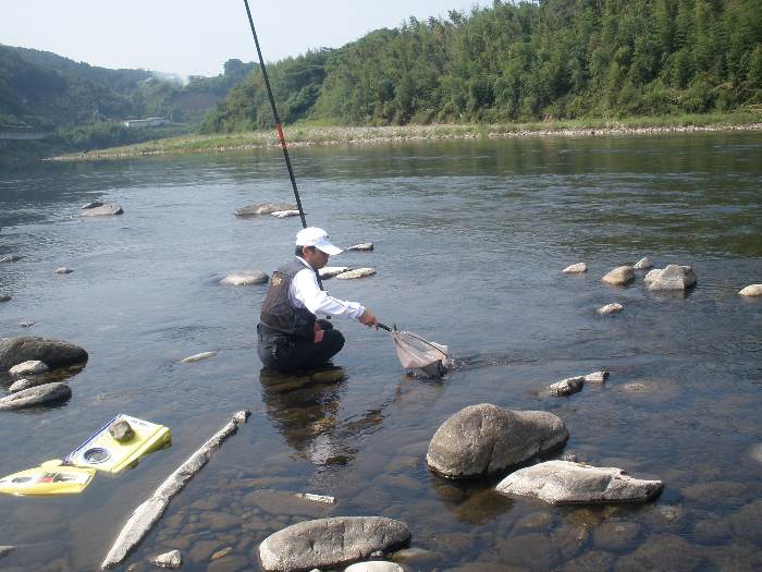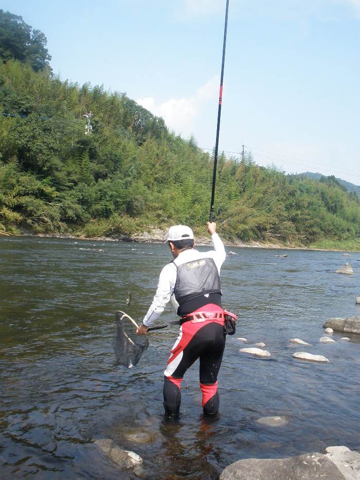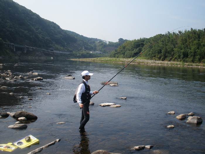 少し涼しさが感じられるようになった8月下旬。 後藤会長と共に、大野川へアユ釣りに出掛けてみました。 アユ釣り初心者の田野会員は、道具全てを後藤会長にお借りしての釣行。 そして、後藤会長のアドバイスのお陰(?)で、早速1匹ゲット! しかし、その後はまったくアユが掛からず数時間の沈黙の時間を過ごしました・・・。 一方、後藤会長はコンスタントにアユを掛けて行き、朝も遅い時間からの竿出しにも かかわらず、午前中で20匹弱の釣果。 午後になっても田野会員にはまったくアユが掛からず、納竿間際にようやく2回アユを 掛けたものの、一回目はバラシ・・・。2回目は、抜き上げてタモに納めたと思ったら、 タモの中には囮アユのみ・・・。結局1匹のアユを手中にして本日は納竿となりました。 なかなか奥深いアユ釣り・・・それだけにハマりそうです。