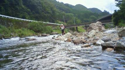 後藤会長とともに、アユ釣り初心者の安藤会員・田野会員の3名で番匠川へ