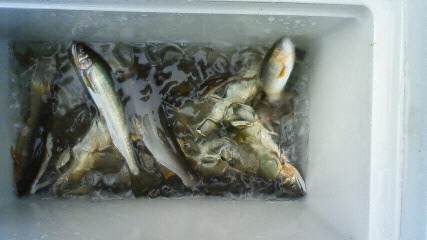 アユ釣り初心者の安藤会員と田野会員は、それぞれ6匹と5匹のアユを掛ける