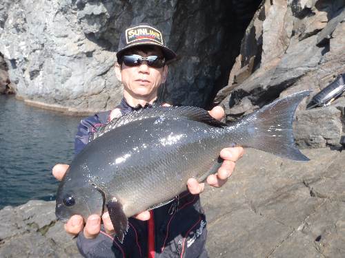 沖黒の洞窟と沖の作バエにて竿出しし、ヒットするタナは5ヒロ前後と深く、アタリも散発的な状況
