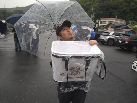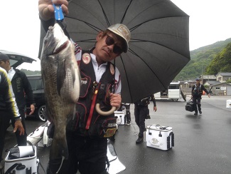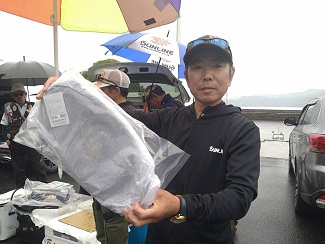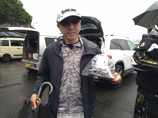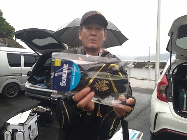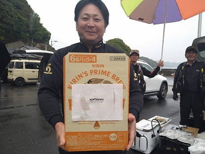 ジャンケンに勝ってフィッシャュキーパーバッカンとハードバッカンのセット賞品をゲットした他魚の部1位の谷川さん。